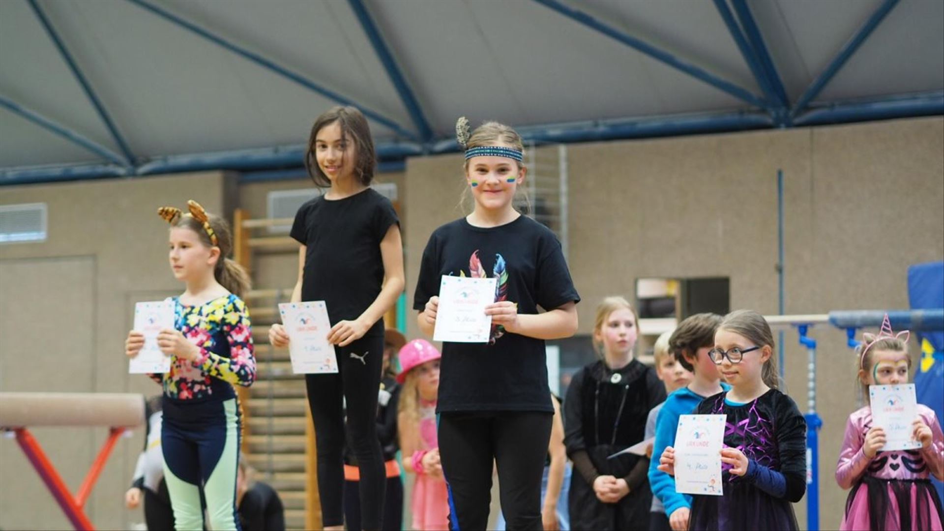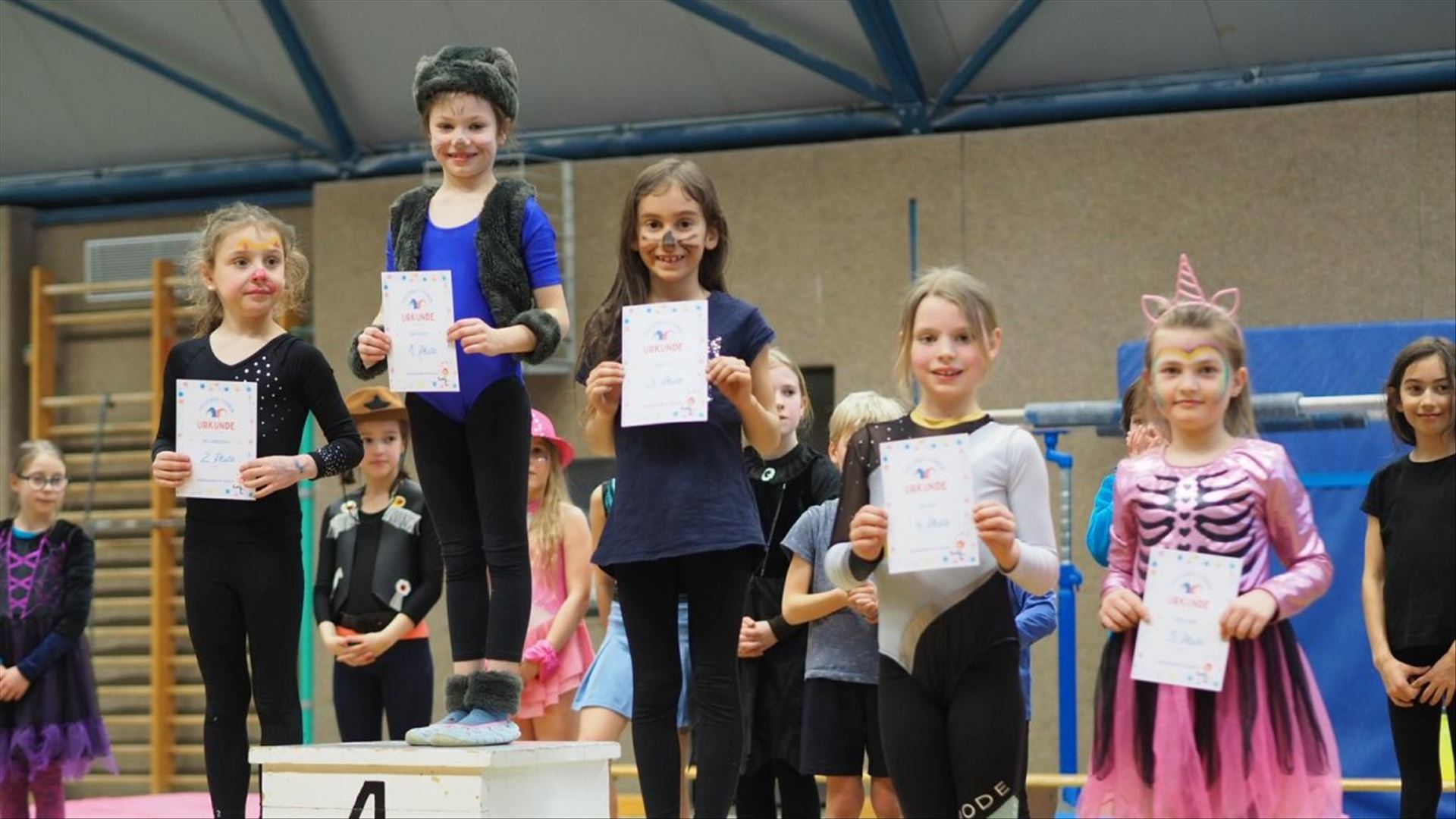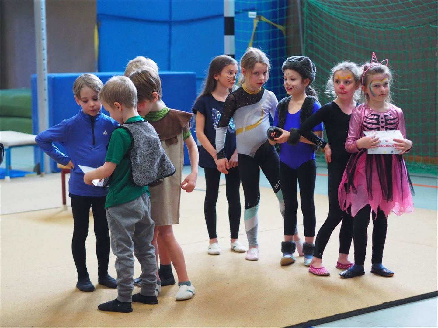 Das bedeutet, die Kinder durften verkleidet zum Training kommen und auch in Kostümen turnen. Nach einer lustigen Erwärmung wurden die Riegen für die sechs Stationen eingeteilt, und der Wettkampf konnte beginnen. Neben den klassischen Stationen wie Sprint, Kletterstange, Winkelhang, Rumpfbeugen und Seilsprung gab es zusätzlich eine Klimmzug-Station, mit der man noch einige Pluspunkte sammeln konnte.