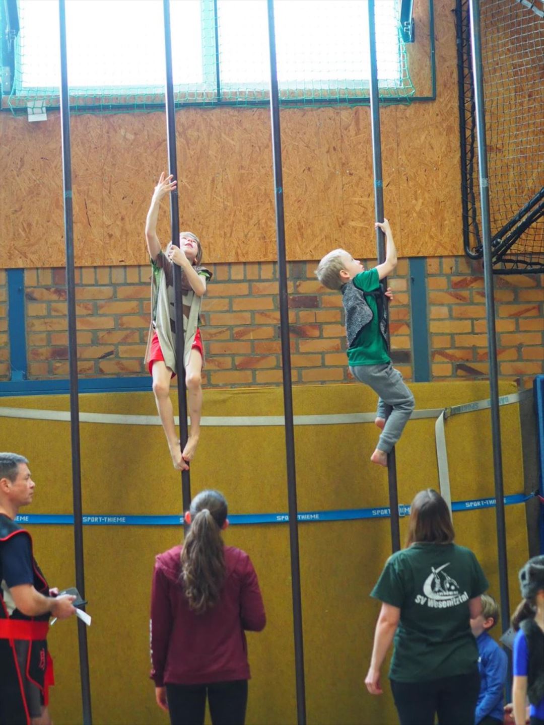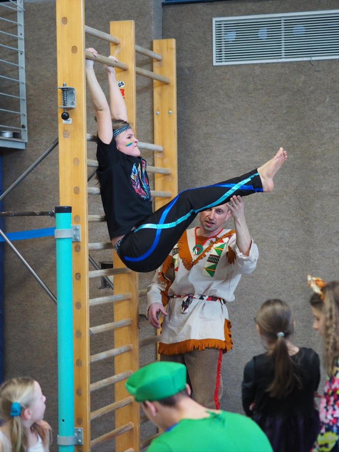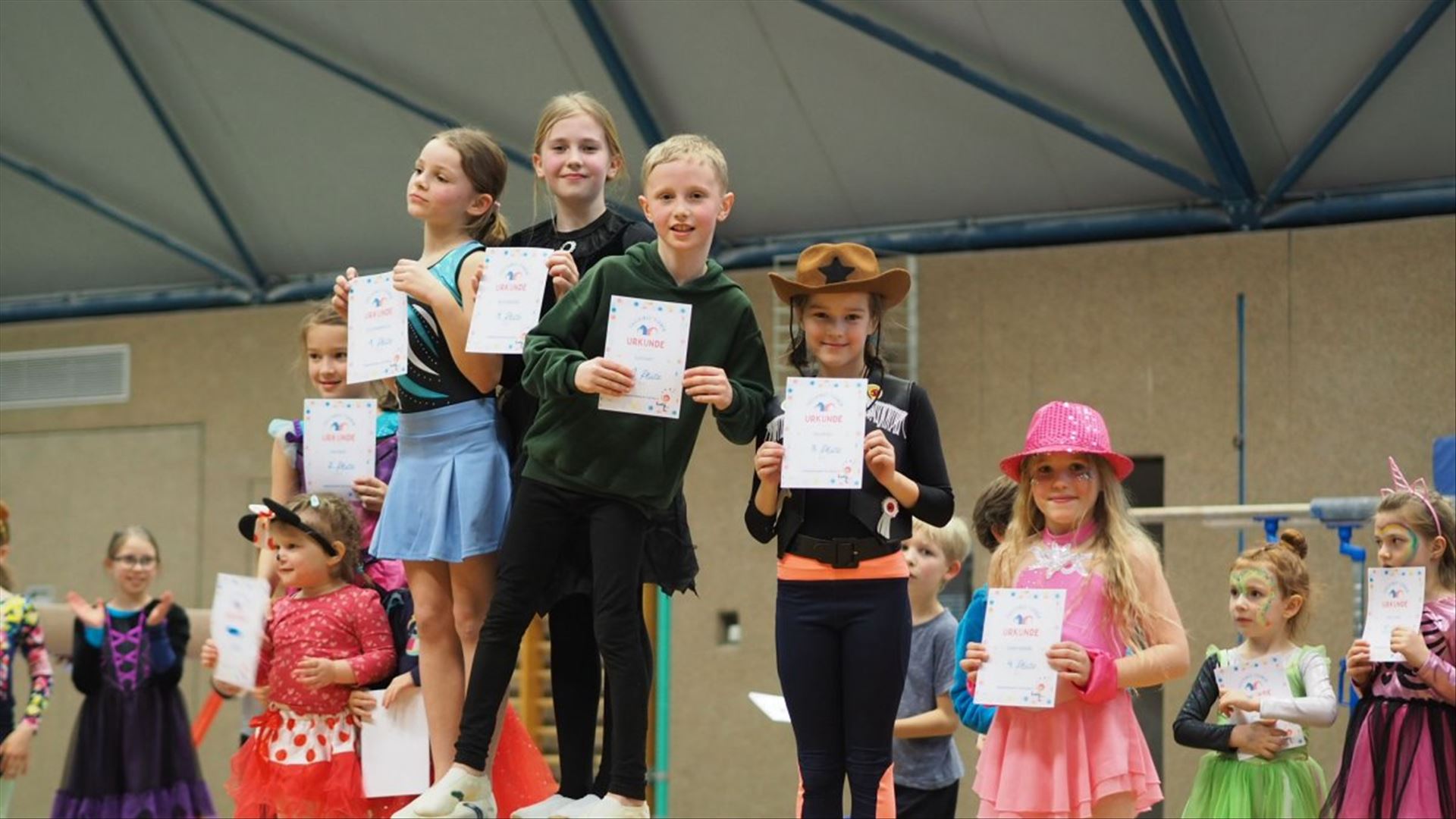 Das bedeutet, die Kinder durften verkleidet zum Training kommen und auch in Kostümen turnen. Nach einer lustigen Erwärmung wurden die Riegen für die sechs Stationen eingeteilt, und der Wettkampf konnte beginnen. Neben den klassischen Stationen wie Sprint, Kletterstange, Winkelhang, Rumpfbeugen und Seilsprung gab es zusätzlich eine Klimmzug-Station, mit der man noch einige Pluspunkte sammeln konnte.