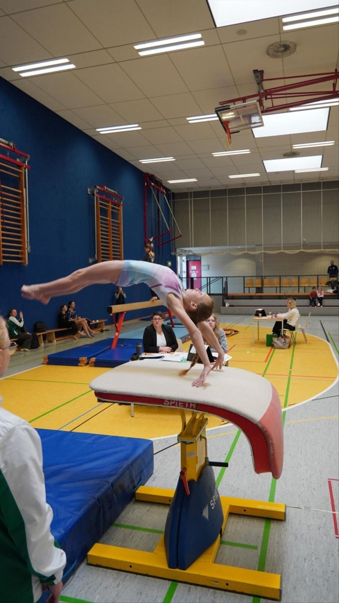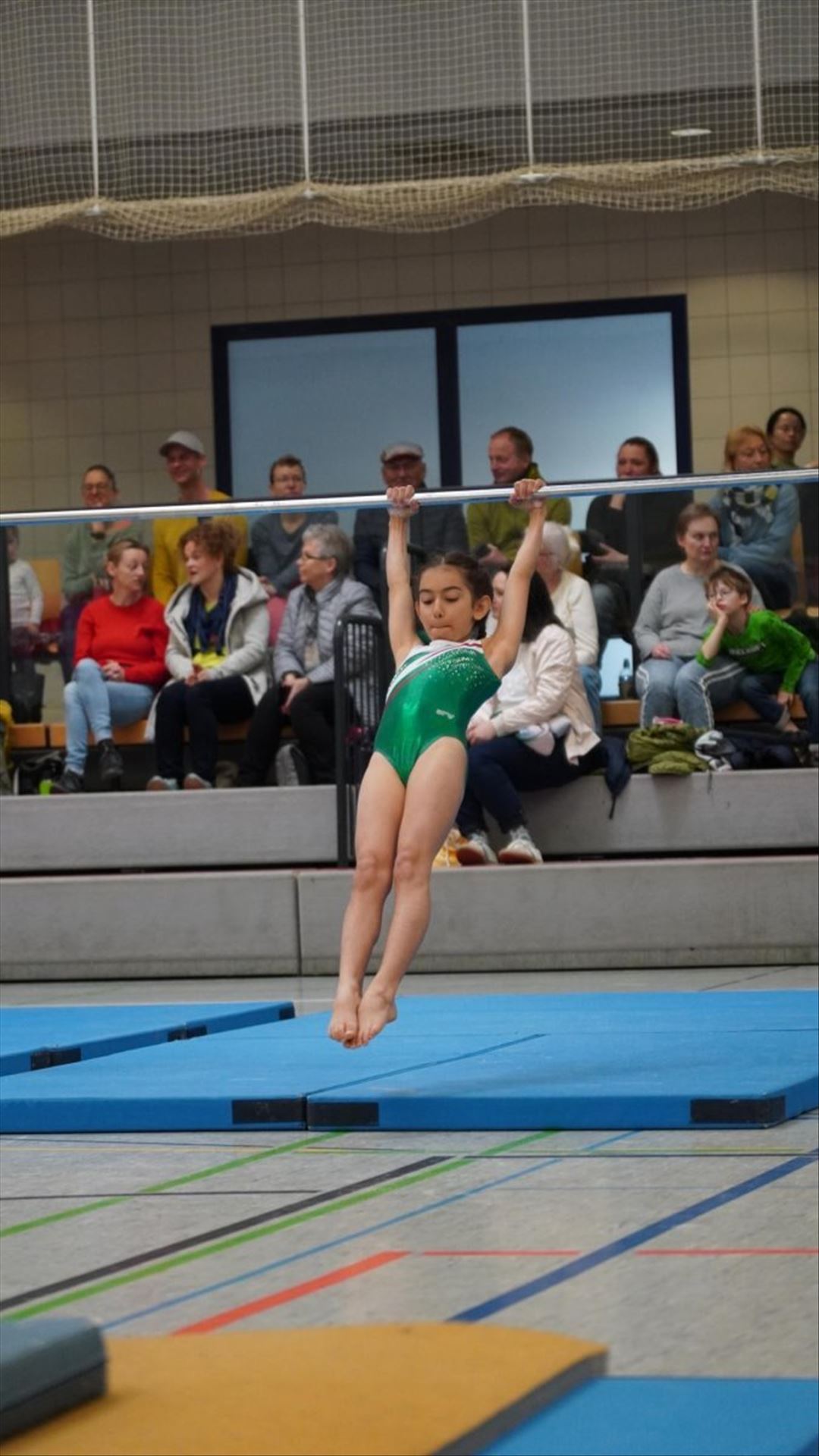 Im ersten Durchgang turnten Lena Dietrich, Isalie Hujer, Mia Schneidereit und Frieda Michael in der AK 6/7 und Nancy Zimmermann in der LK 4. In der Pflicht zeigten unsere unsere Mädels tolle Reck-Übungen. Lena turnte auch an allen anderen Geräten super Übungen und konnte sich über den 2. Platz und somit den Vize-Bezirksmeistertitel freuen. Bei Mia, Isalie und Frieda schlichen sich leider einige Patzer ein, weshalb sie auf den Plätzen 20, 34 und 39 landeten. Bei Frieda kam hinzu, dass ihre Sprünge leider ungültig waren, wodurch sie sich eine Platzierung im Mittelfeld verbaute. Bei Nancy in der Kür ging es super am Boden und Sprung los. Mit den sauberen Übungen konnte sie sich einen Vorsprung erturnen, welcher sogar den Sturz am Balken verzieh. Somit konnte sich Nancy erneut den Bezirksmeistertitel sichern.