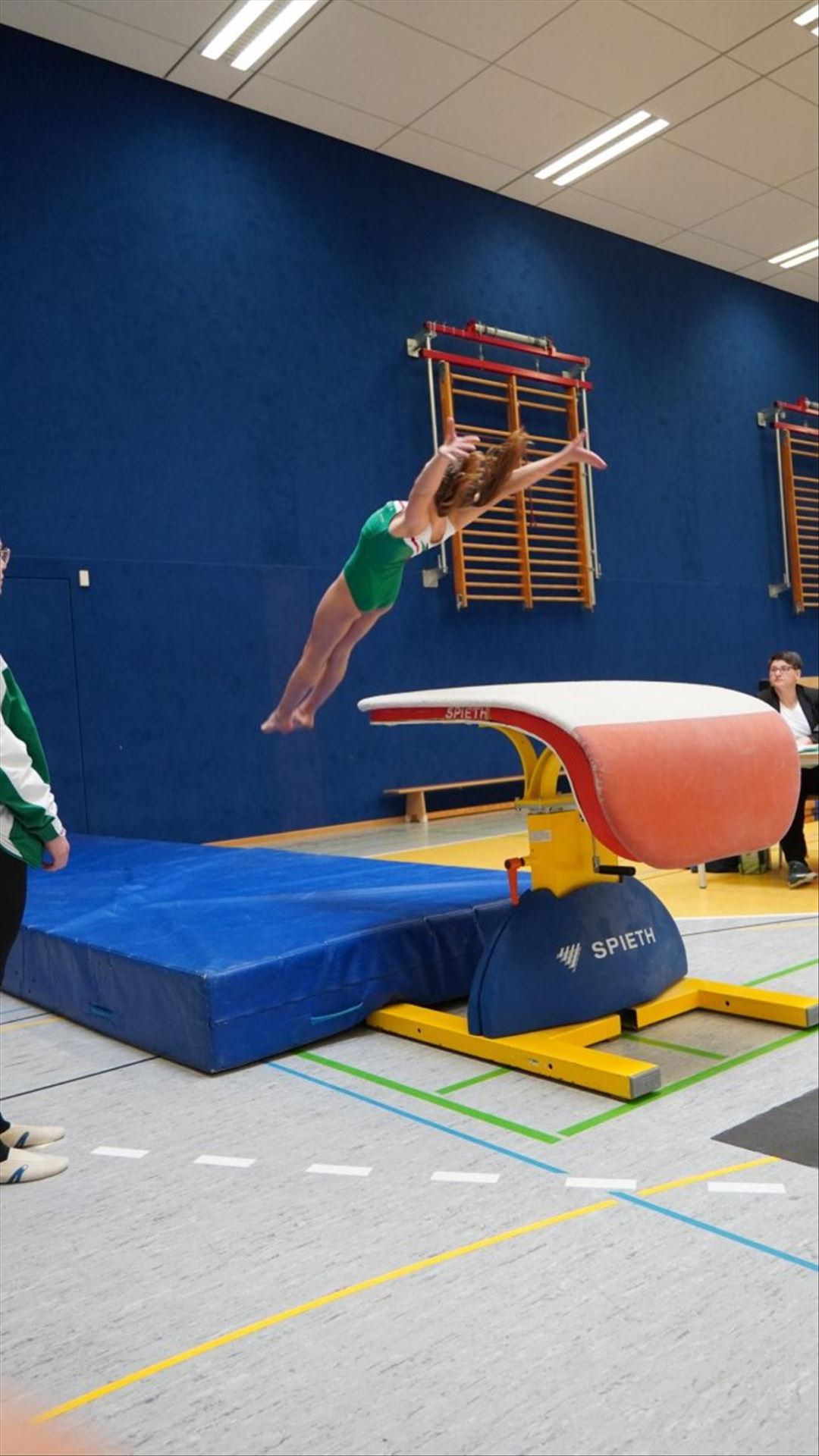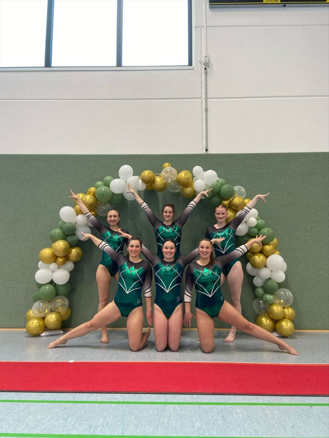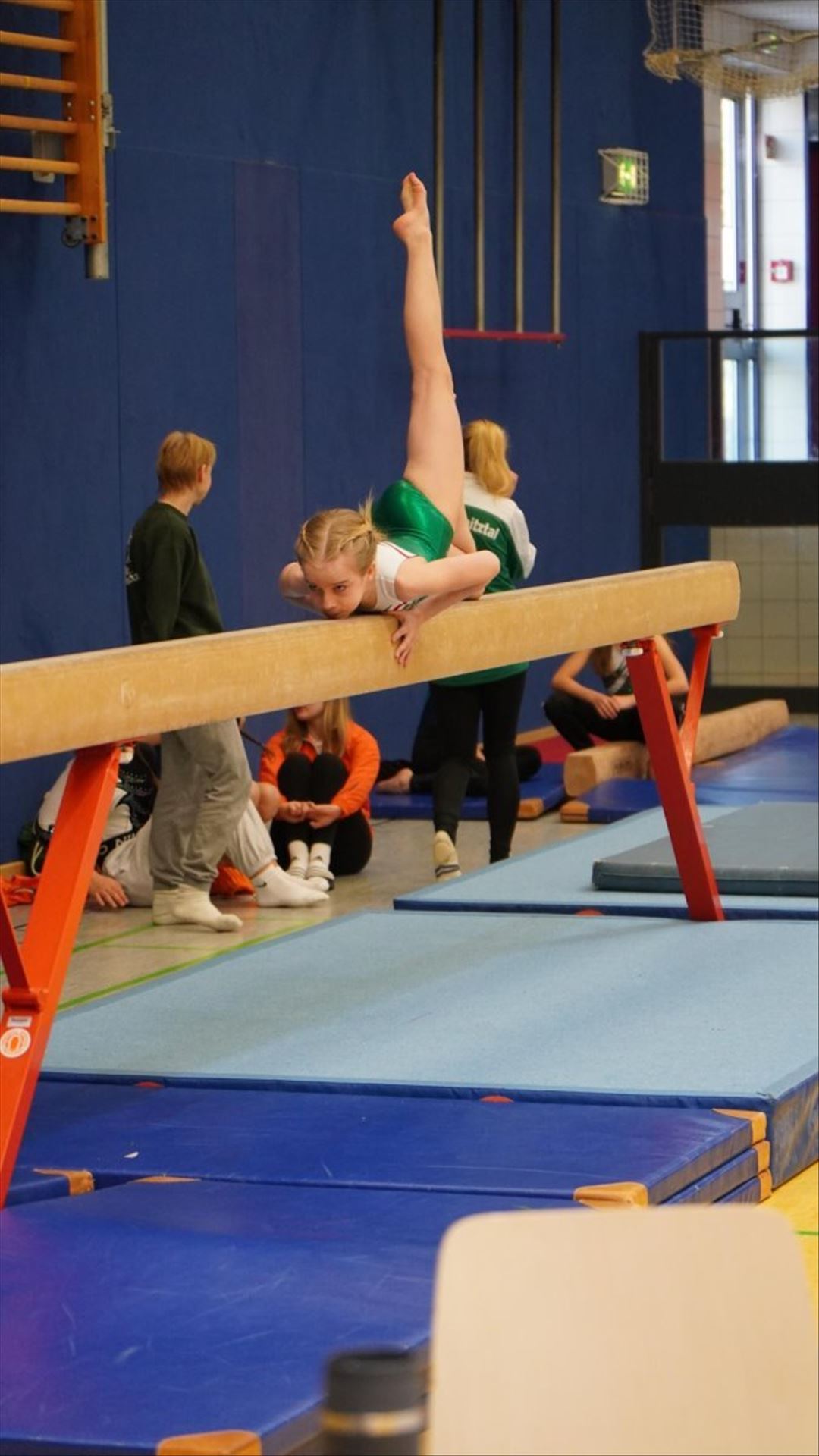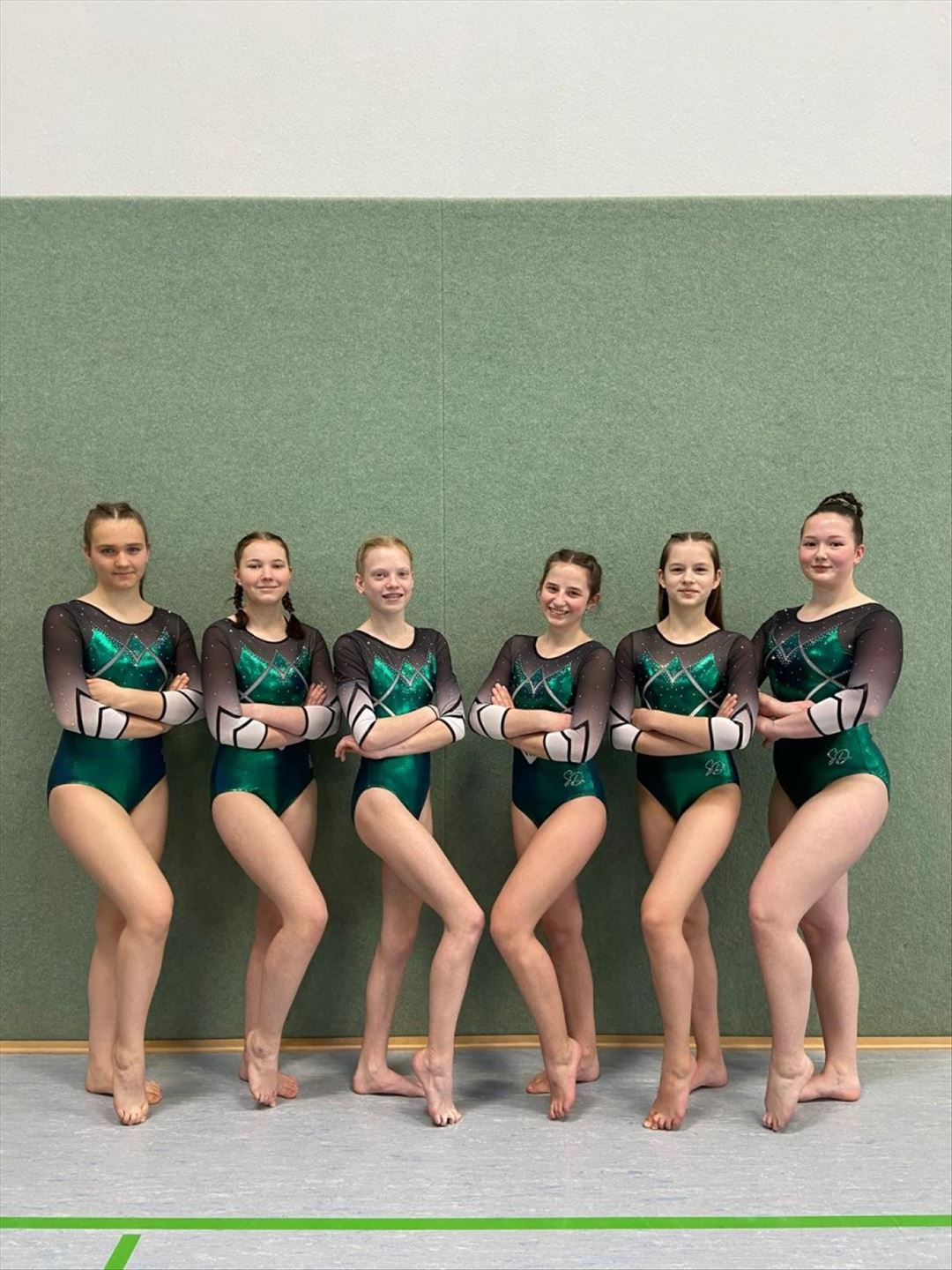 Direkt im Anschluss im 2. Durchgang durfte dann die Mädchenmannschaft in der 3. Landesliga Staffel 1 turnen, nachdem sie im vergangenen Jahr erfolgreich ihren Platz verteidigt hatten. Die Mannschaft mit Fiona Rietzschel, Philine Horschke, Thea Vieluf, Mira Luna Eisold, Victoria Elisabeth Kaiser und Linnea Gebhardt startete am Zittergerät Balken mit sicheren Übungen und damit einem guten Einstieg in den Wettkampf. Am Boden musste die Mädchenmannschaft genau wie die Frauen ein paar Abzüge in Kauf nehmen, da die Schwierigkeiten ihrer Übungen im Gegensatz zu den anderen Vereinen, in denen teilweise ausschließlich erwachsene Frauen turnten, etwas niedriger waren. Mit vier soliden Sprüngen am Sprung und tollen Übungen am Stufenbarren konnte die Mannschaft anschließend noch ein paar tolle Wertungen holen und sich am Ende auf Platz 7 turnen.