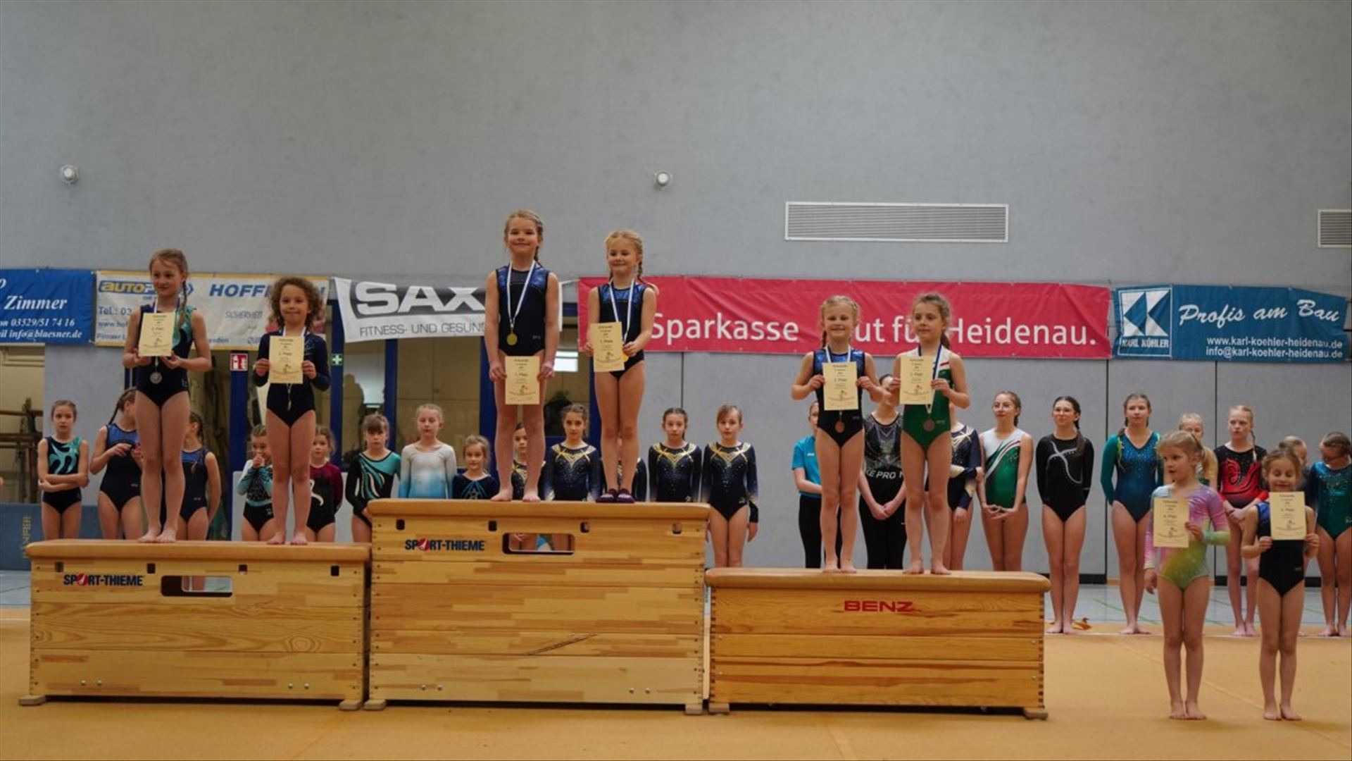 Die Mannschaft wurde dabei von zwei Turnerinnen des SSV Heidenau unterstützt. Am Ende des Abends erreichte die Mannschaft den 3. Platz, hinter der starken Konkurrenz vom SV Pesterwitz (1. Platz) und den Gastgeberinnen aus Stolpen (2. Platz.) Hervorzuheben sind die zwei Besten des Abends: in der LK 4 am Balken - Anne Szarvasy mit 12,35 Punkten und - am Stufenbarren Lydia Swiersy mit 12,80 Punkten. Herzlichen Glückwunsch! Vielen Dank an unsere Kampfrichterinnen und den SV BlauGelb Stolpen für die Ausrichtung des Wettkampfes. Wir freuen uns auf das nächste Jahr!