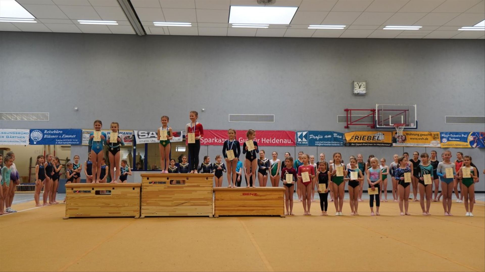 Bei dem Einstiegswettkampf, wo die meisten Turnerinnen das erste Mal ihre neuen Übungen in der höheren Alters- oder sogar Leistungsklasse zeigen dürfen, gehen in die Gesamtwertung nur drei der vier Geräte ein. Damit kann man sich einen kleineren Patzer erlauben oder neue schwierigere Elemente ausprobieren.