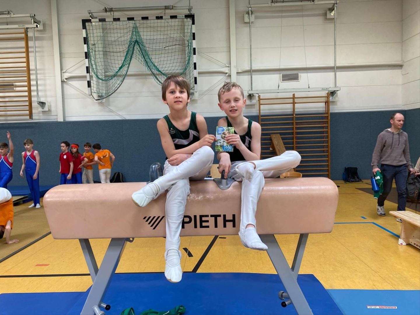 Am Vormittag starteten Elias Kraft und Titus Heirler in der Pflichtklasse der AK 8/9. Obwohl beide sehr aufgeregt waren, konnten sie doch ihre Trainingsleistung an allen sechs Geräten abrufen und sich viele Punkte erturnen. Elias erreichte mit nur 0,2 Punkten Rückstand zum Nächsten Platz 7, während Titus Platz 8 um 5 Hundertstel verpasste und damit 9. wurde.