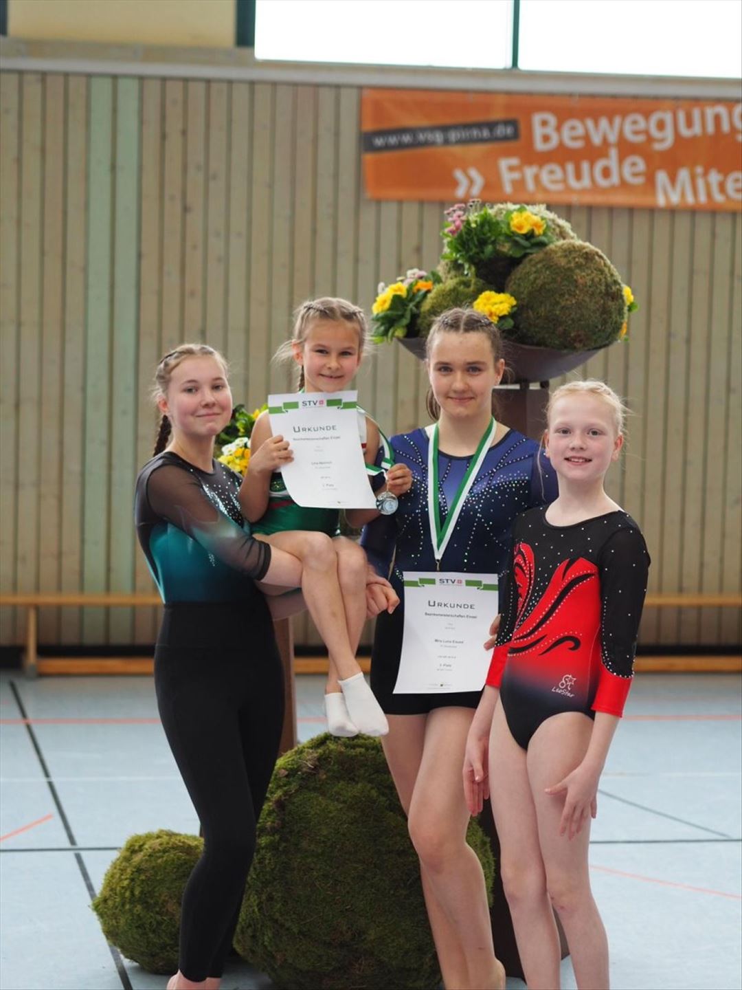 Bei den Frauen konnten wir gleich zwei Mannschaften stellen. In der LK4 turnten Saskia Westphal und Jasmin Weikert mit zwei Turnerinnen aus Stolpen zusammen und konnten sich souverän mit mehr als 10 Punkten Vorsprung den Sieg sichern. In der LK3 startete eine reine Wesenitztaler Mannschaft mit Lydia Swiersy, Marie Kempe, Victoria Elisabeth Kaiser und Mira Luna Eisold. Sie starteten am Sprung mit tollen Sprüngen, ließen aber an den folgenden Geräten zu viele Punkte liegen. Am Ende reichte es aber für Platz 3.