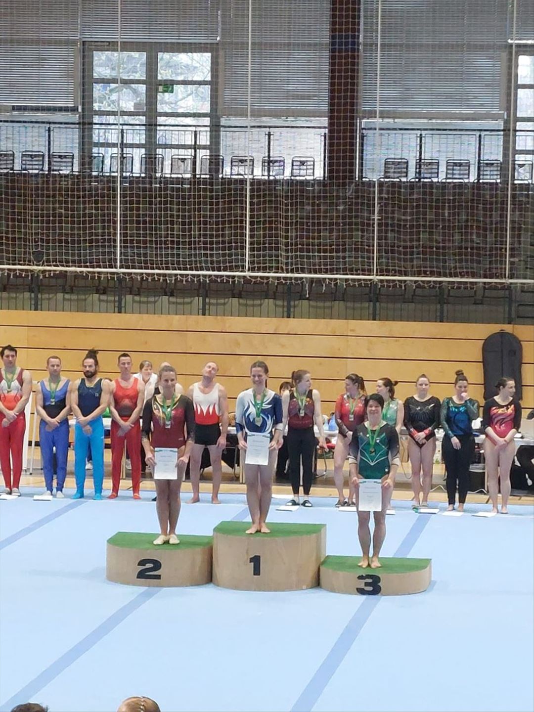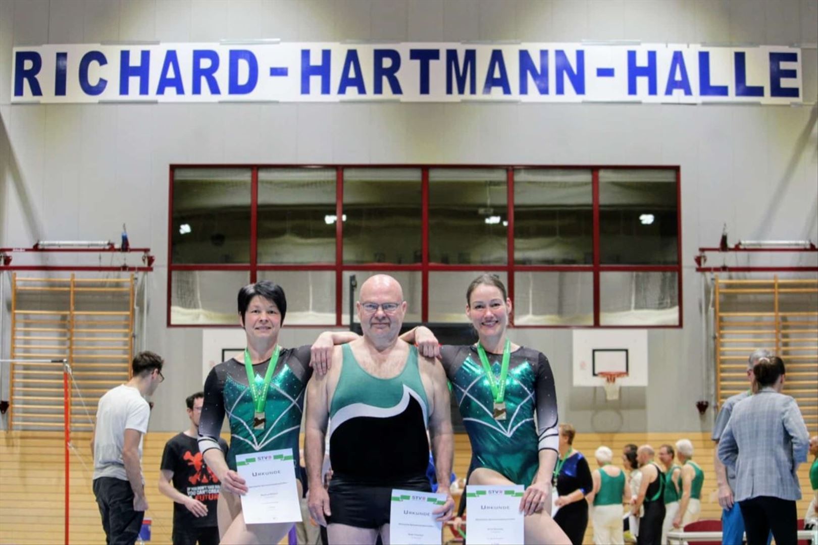 Im Gerätturnen zählt man bereits ab 30 zu den Senioren. Anne und Beatrice starteten in der LK 3, Bodo in der LK 4. Beatrice hatte einen guten Start am Sprung, musste allerdings am Stufenbarren und am Balken jeweils einen Sturz in Kauf nehmen. Durch sauberes Durchturnen und eine schöne Bodenübung erreichte sie Platz 3. Bei Anne lief es super. Sie kam sturzfrei durch den Wettkampf und konnte sich mit ihren sauberen Übungen ebenfalls über den dritten Platz freuen.