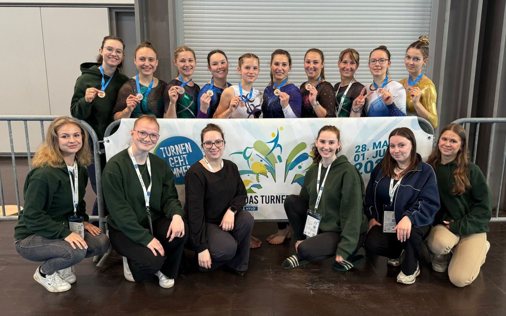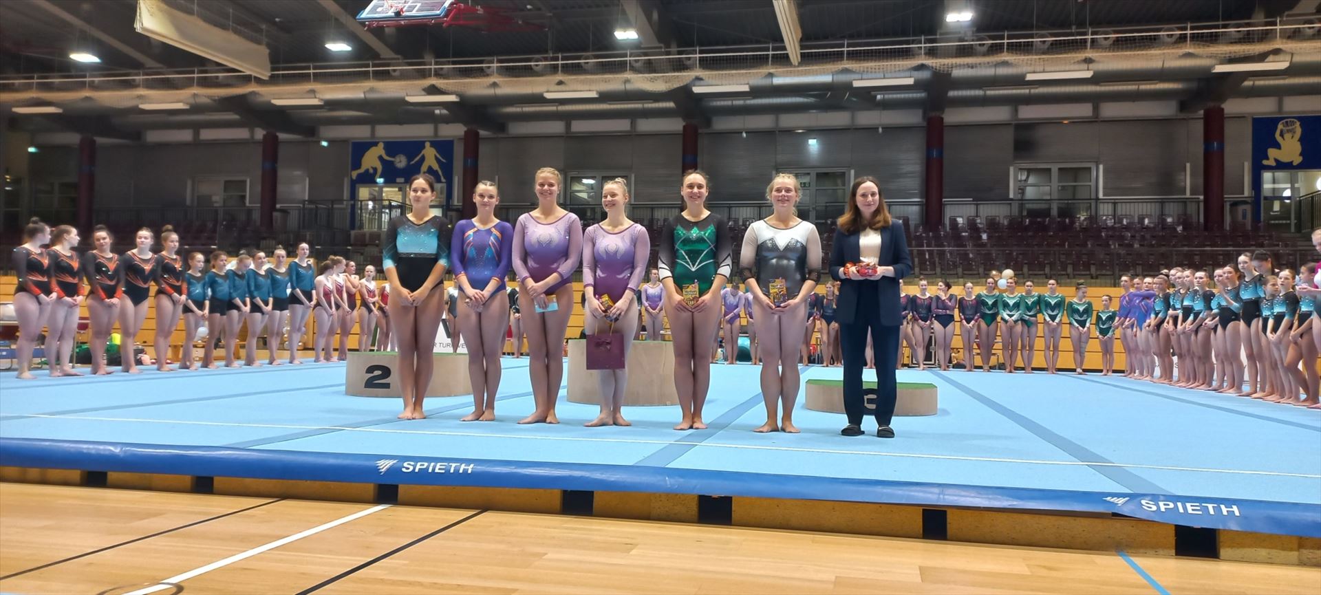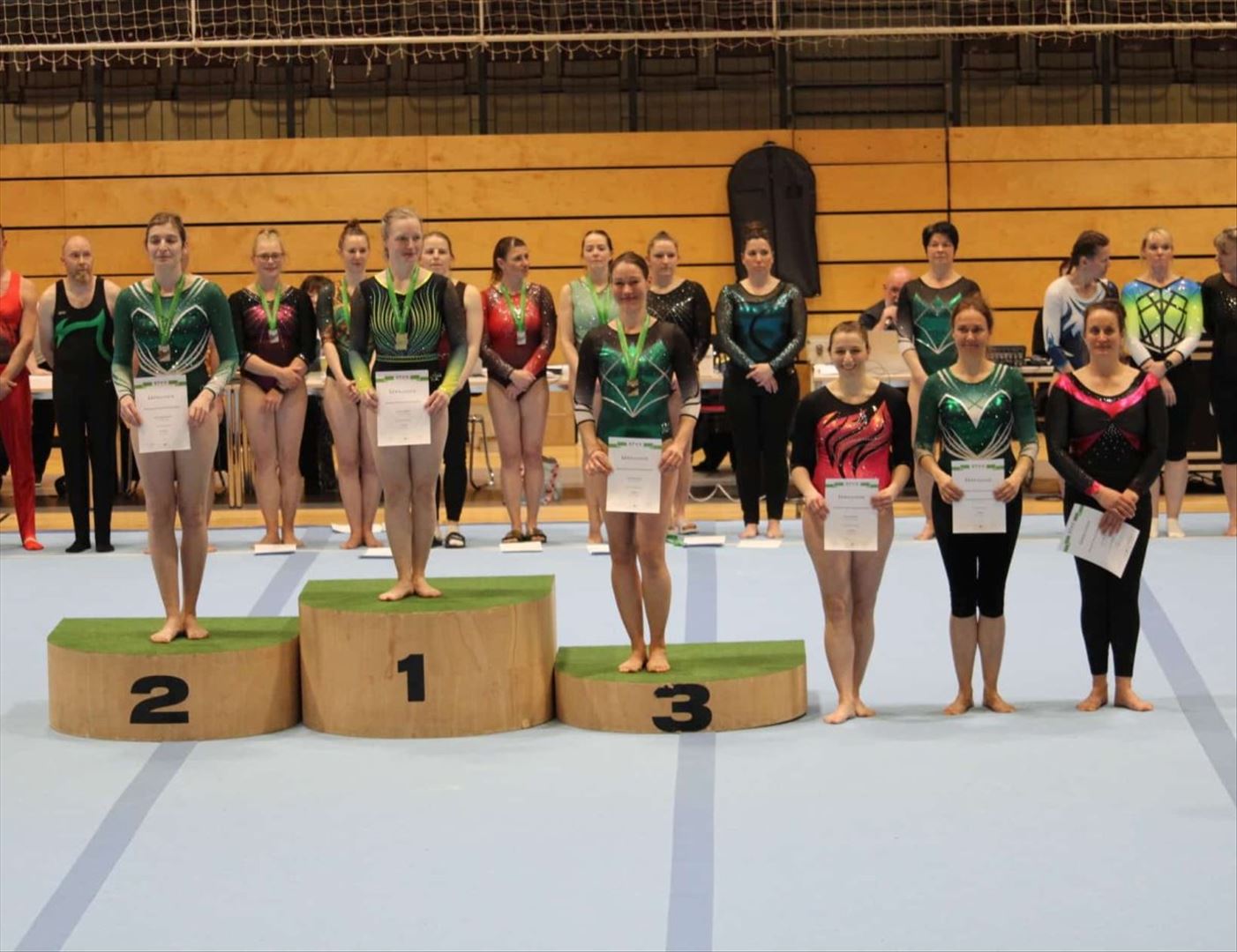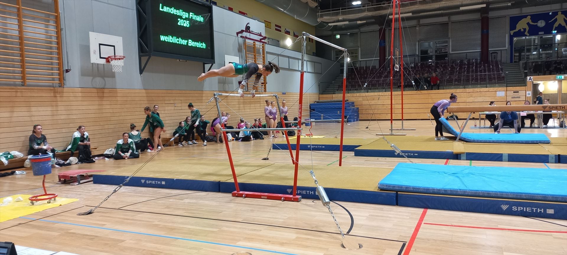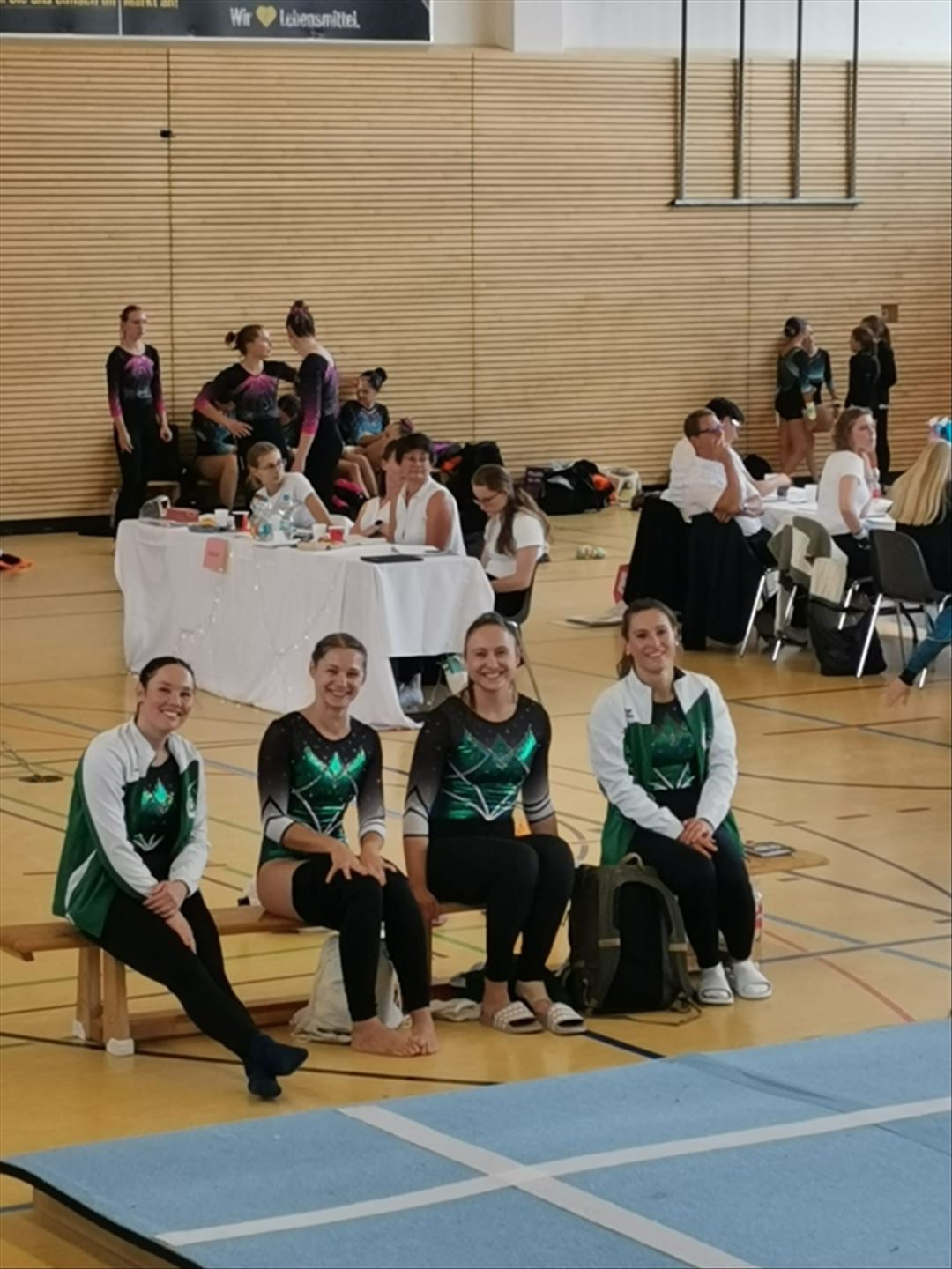 Früh am Morgen im ersten Durchgang ging es für die Frauen mit Boden los. Aufgrund der schwierigeren Anforderungen in dieser Liga, bei der die Leistungsklasse 1 geturnt werden muss, konnte die Mannschaft trotz sauberer Übungen noch nicht ganz mit den Wertungen der anderen Vereine mithalten. Für alle aus dem Team bis auf Julia war es allerdings der erste LK 1- Wettkampf überhaupt, so dass sich die erturnten Wertungen trotzdem zeigen ließen. Weiter ging es mit Sprung, an dem mit vier guten Sprüngen wichtige Punkte erturnt wurden. Auch am Stufenbarren und Balken kamen alle vier Turnerinnen jeweils ohne Sturz durch die Übung, so dass die Mannschaft verdient hohe Wertungen bekam und den Rückstand vom Boden aufholen konnte. Vor der Siegerehrung war die Anspannung extrem groß, da die Frauen aufgrund des erstmaligen Starts in der 1. Landesliga ihre Leistung gegenüber den anderen Vereinen noch nicht einordnen konnte. Umso größer war die Freude bei der Siegerehrung als feststand, dass es für den 4. Platz von insgesamt acht Mannschaften mit einem hauchdünnen Abstand zum 3. Platz gereicht hat. Damit konnte ein super Grundstein für den Verbleib in der 1. Liga gelegt werden. Zudem erturnte Julia in der inoffiziellen Einzelwertung den 3. Platz.