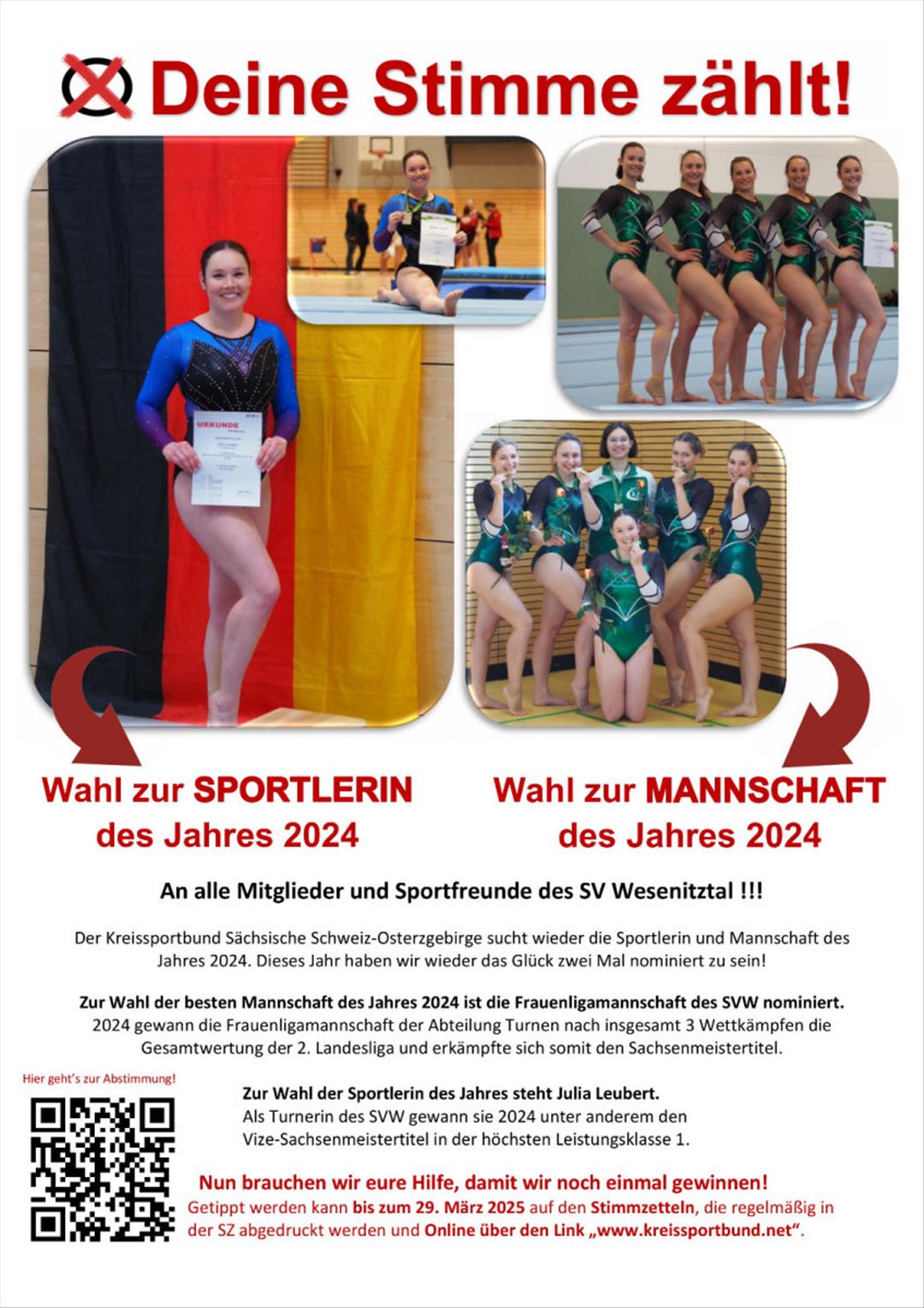 Bis einschließlich 29. März 2025 freuen wir uns wenn ihr eure Stimme Julia und der Frauenligamannschaft unseres Vereines gebt. Außerdem kann mit den Original-Tippscheinen, die in der SZ und SamstagSZ abgedruckt werden, abgestimmt werden.